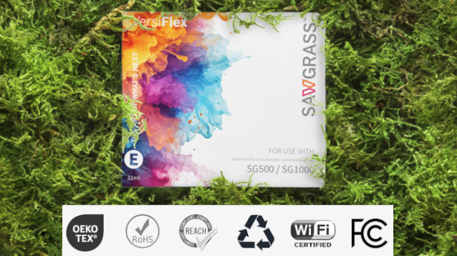 Sawgrass inks are water-based and solvent-free, designed with sustainability in mind. Cartridges and packaging are recyclable, and the inks meet strict quality and safety standards. VersiFlex inks are REACH compliant and RoHS certified.